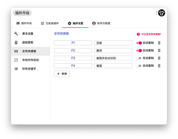 #ESC 键 快速回到主输入框 在任何进入插件后,可以通过 esc 快速回到初始状态。 #窗口分离 uTools 插件都自带图形界面,或许有些时候你希望长时间使用某个插件,或是希望同时开启多个相同的插件,这个时候,你只需按 ctrl + d( mac 下 command + d ),即可以将插件脱离 uTools 主输入框,把插件当成一个独立的应用程序来使用。 #自动识别 安装对应的插件后,uTools 可以自动识别文本格式,并列出能够处理此文本的插件供你选择。 例如: 通过超级面板划词翻译:复制一段英文->通过长按右键或者中键唤出超级面板->选择「翻译」插件->松开鼠标按键得到结果。 通过输入框编辑 JSON :复制一段 json 字符串->呼出 uTools (会自动粘贴)->选择「 json 」插件->得到结果。 #全局快捷键 uTools 已经可以快速的辅助你解决一些小场景的问题,但是在使用很频繁的一些场景,合理的使用全局快捷键可以一键直达,快上加快。 首先,你需要在「 setting 」中配置全局快捷键,事例如下图: setting.png 设置 F1 为「百度」功能,按 F1 将打开插件,如果启用『自动复制』,将自动打开浏览器搜索当前选中的内容。 设置 F2 为「翻译」功能,当复制一段文本后,在5秒内按 F2 直接翻译复制的文本。 设置 F3 为「截图并自动识别」功能,将调用系统截图,完成截图后,进入插件自动识别图片中的文字。 设置 F4 为「截图」功能,将调用系统截图。