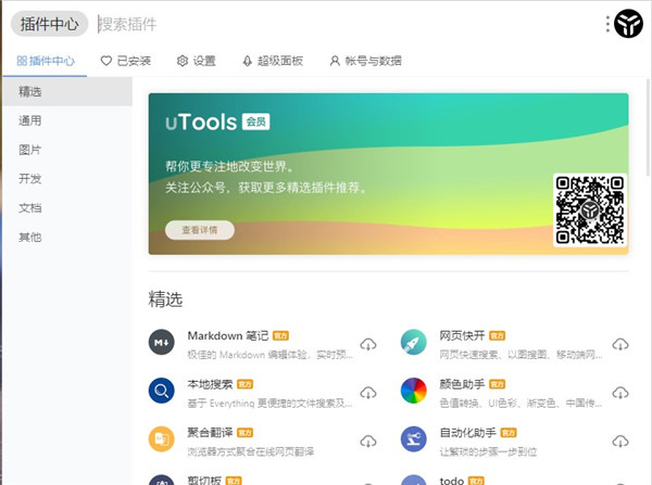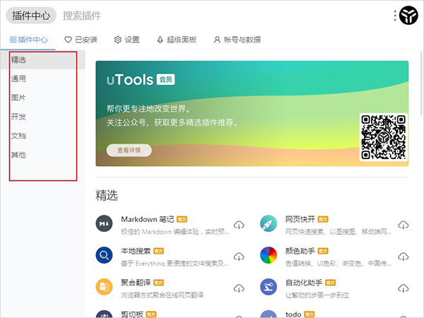 7、在插件中心查找你需要的插件,这里分为精选、通用、图片、开发等类型的插件素材;