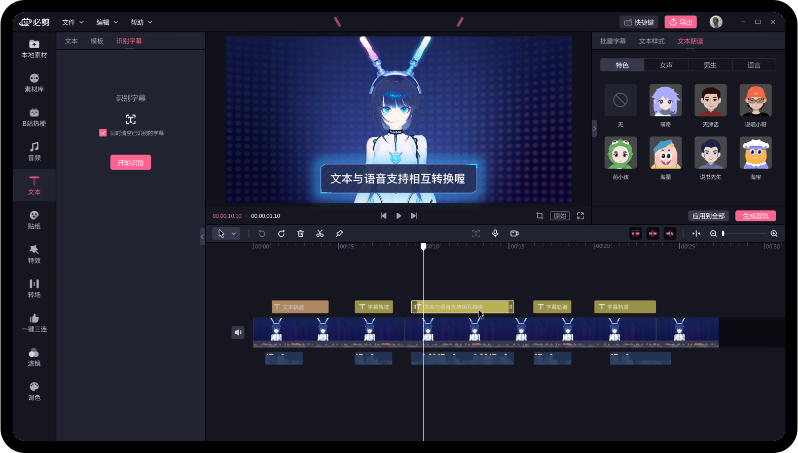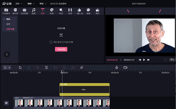 一是字幕识别,必剪能够将视频和音频素材中的语音自动识别并显示为字幕,省去了用户手动输入文字的复杂过程;