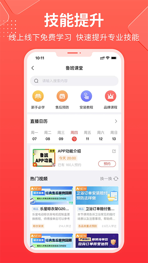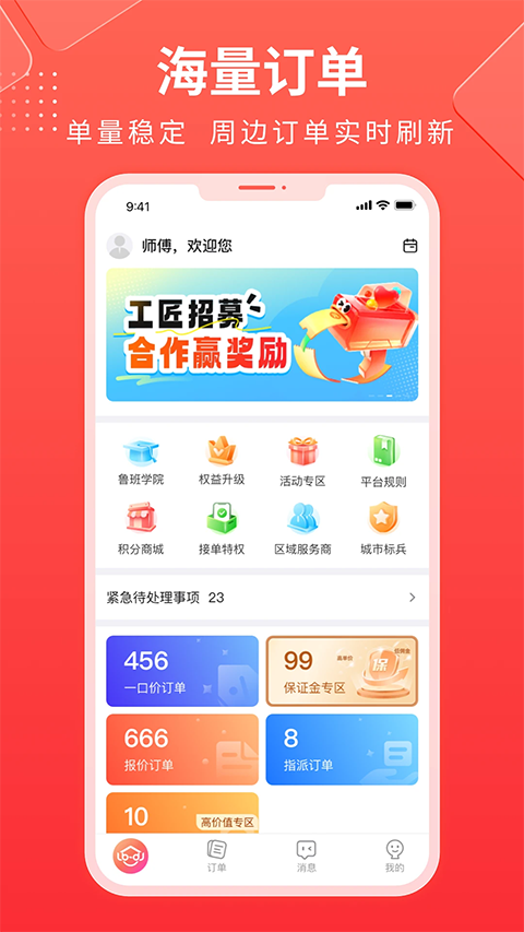 1、海量订单: 业务遍布全国,覆盖全国4万多个街道,与300多万家居建材商家达成合作关系,海量订单长期稳定。 2、商家类型多: 平台聚合了家具、家电、卫浴、晾衣架、灯具、智能锁、门窗、健身器材、充电桩、广告海报、智能设备、工程项目等数百万家居商家&千万家庭用户的服务需求,师傅随时随地即可实现服务交易。 3、接单自由: 接单模式多,自主报价、标准一口价、总包指派,根据师傅自己时间安排、订单信息、服务距离等自由接单。 4、免费入驻: 师傅入驻不存在加盟费、入驻费等强制费用,只要你专业就能在这里发光。 5、担保交易: 平台拥有在线担保交易体系,商家付款后才进行服务,杜绝拖债赖债的现象。 6、技能提升: 平台打造“鲁班课堂”通过“线上+线下”提供免费专业技能培训,打造标杆师傅,让师傅技能更专业更全面。 7、专属客服: 有问题找客服,专业客服实时在线,快速响应快速解决服务纠纷/维权/钱款/订单/发货等一切问题。更新日志
