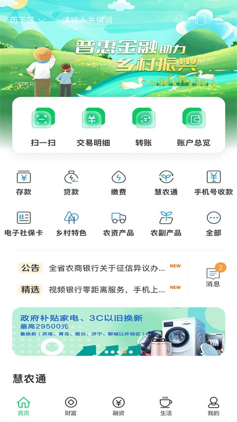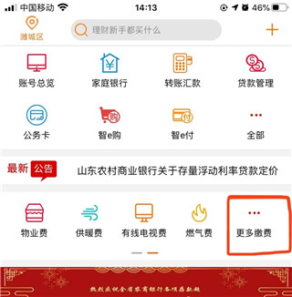 1、打开青岛农商银行APP官方版后,也就是我们俗称的山东农信APP,进入“首页”状态:在“电费 水费……”一栏向左滑动,找到“更多缴费”,点击进入。