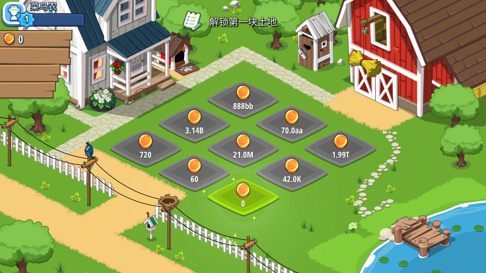 1、线解锁土地,点击0金币解锁的土地。