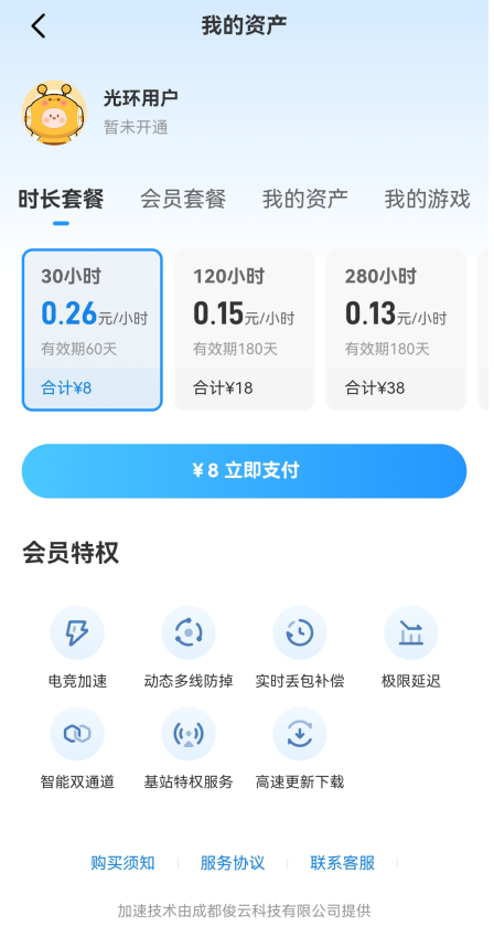 分为网络加速和画面加速,接下来我会分别为大家介绍 一、光环会员网络加速器 1、在【我的光环】页面点击【网络加速】可以购买光环加速会员,拥有电竞加速、动态多线防掉、实时丢包补偿等特权。 适用范围:国际服游戏、部分单机游戏