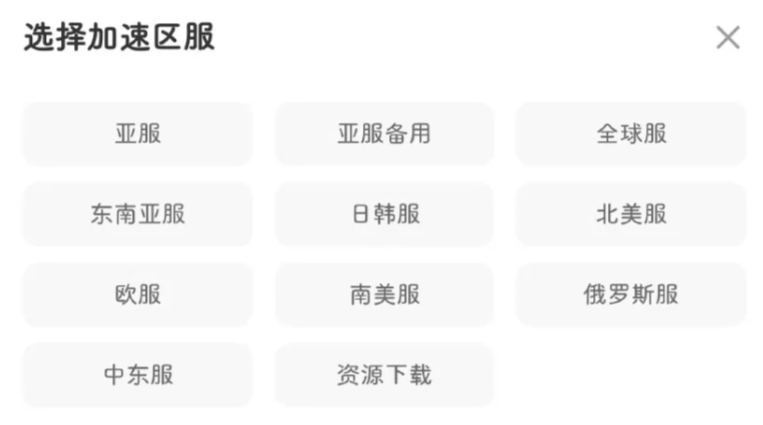 3、点击【网络加速】旁边的箭头会展开其他加速区服。如果没有可以加速的区服,则没有下拉箭头。不同的游戏可加速的区服不一样。