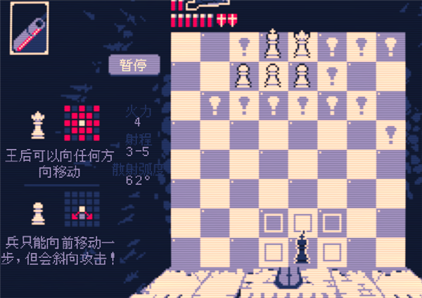1、保留国际象棋基本规则,但玩法彻底革新,融入Roguelike、射击元素。 2、开枪后会消耗弹药,必须再次移动才能完成装弹。 3、在每一层结束后,玩家可以从两组随机的组合中进行选择,让己方和敌方都获得一种升级。霰弹国王手机移植版玩法攻略