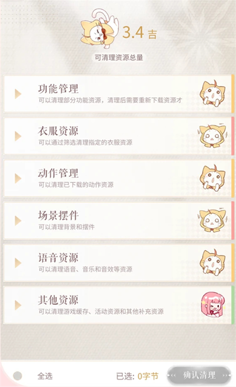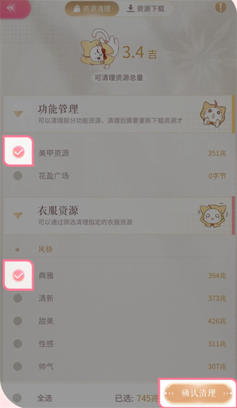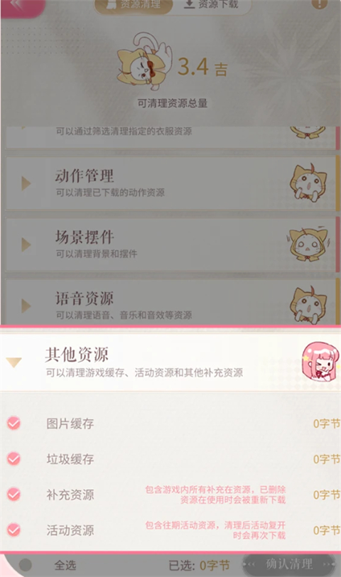3、计算完成后,搭配师们可以勾选想要清理的资源类型,点击底部【确认清理】按钮即可清理所有勾选资源!