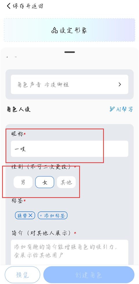6、输入角色昵称以及性别,添加角色标签。