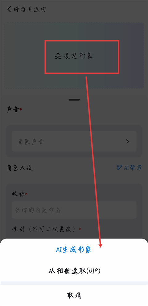 3、首先点击【设定形象】,用户可从相册导入图片生成,也可使用AI生成。
