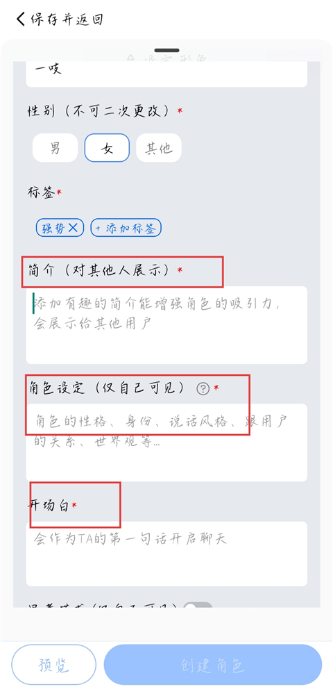 7、接下来就是填写角色简介以及角色设定,然后点击【创建角色】。