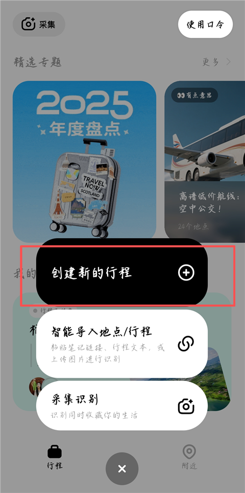 【AI智能规划】 1、打开圆周旅迹app,点击中间【+】图标,点击【创建新的行程】。