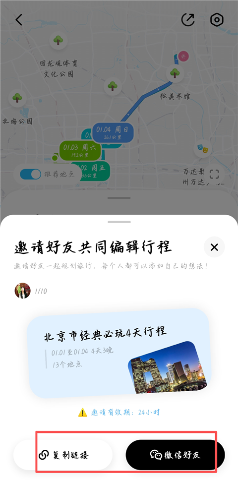4、若要邀请好友,进入行程,点击我们头像旁边的+号图标,点击跳转微信邀请或发送链接给好友即可。