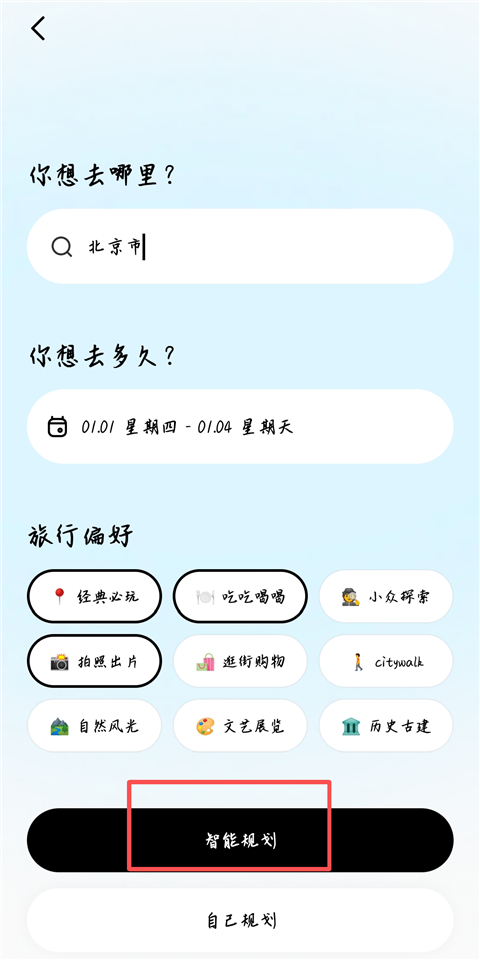 2、输入目的地、游玩日期,选择旅行偏好,然后点击【智能规划】。