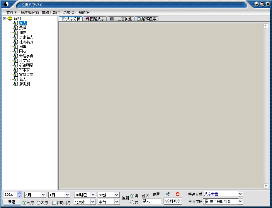 玄奥八字电脑版是一款专业的周易软件程序。它的功能比较全面,能通过命例、时间、地点、性别、姓名等因数,可以快速查看自己的八字命盘,其中会显示排大运、排流年、终身卦、吉神凶煞等许多八字分析详细内容!并且,玄奥八字电脑版内的图解八字,还可以看出测名人的五行分配、六亲形势图、生克分配图等图像介绍!总之,人有生辰八字,用玄奥专业的玄奥八字可以轻松的帮助用户解析姓名人的八字效果,也可以为测名人运气预测和财运预测。感兴趣的用户欢迎下载使用。