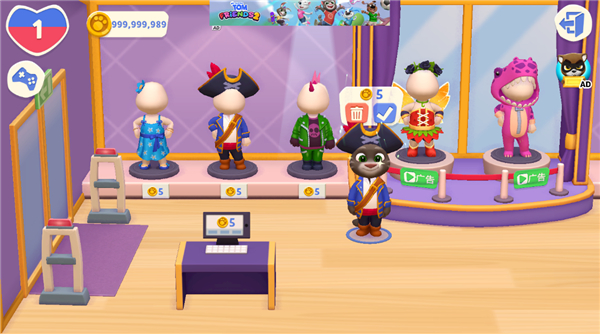 3、将服装拖动在汤姆猫身上看看效果,在头上有一个购买和删除选项。