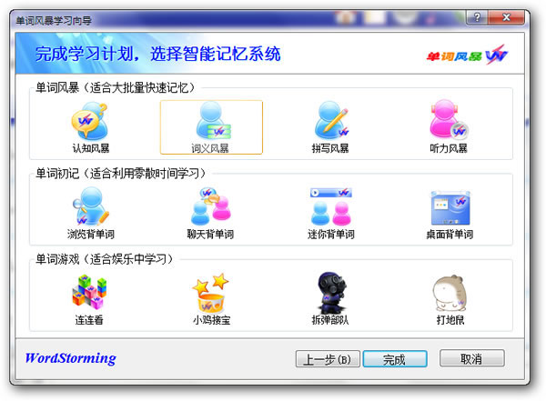 1、单词风暴学习方式 单词风暴软件已经超出了“单词”学习的范畴,不仅可以学习各国语言的单词、句子、口语,甚至可以应用到学习专业术语等等所有需要大量快速对应记忆的场合。 单词风暴包含十二大智能记忆系统:认知风暴、词义风暴、拼写风暴、听力风暴、浏览背单词、聊天背单词、迷你背单词、桌面背单词、连连看游戏、小鸡接宝游戏、拆弹部队游戏、打地鼠游戏。通过选择、拼写、语音识别等方式来完成用户与电脑的互动: