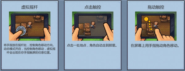 1、虚拟摇杆 将手指放在摇杆处,控制角色移动方向。 动态模式开启,当控制角色移动,虚拟摇杆会出现在你手指触屏的任意位置。 2、点击触控 点击一处地点,角色自动走到那里。 3、拖动触控 在屏幕上用手指拖动角色移动。