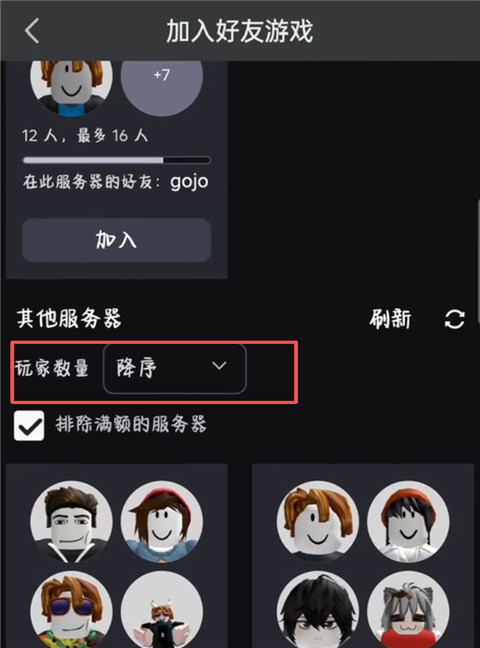 1、进入罗布乐思手游,先勾选排除满的服务器。