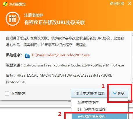 1、如果你选择了“关联多媒体文件”,防病毒软件可能会拦截,以360安全卫士为例,被拦截时要如下图选 “更多”-〉“允许程序所有操作”