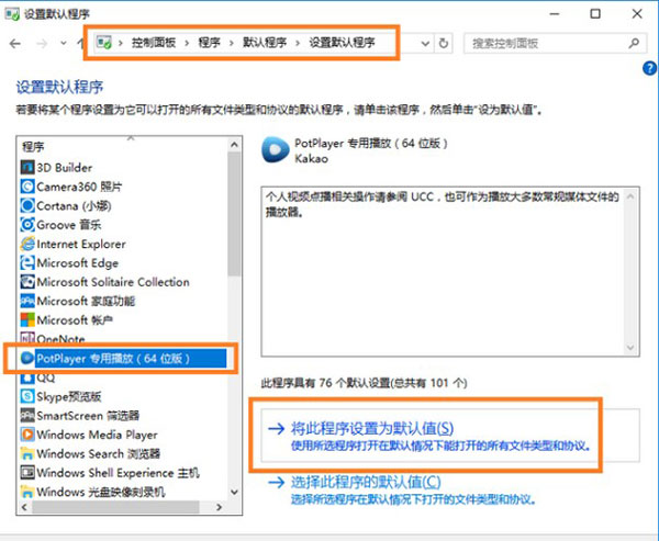 2、Win10系统,文件关联后要到控制面板“设置默认程序”才能完全生效,下图以PotPlayer为例(也可以在PotPlayer设置里“关联”-〉设置控制权)