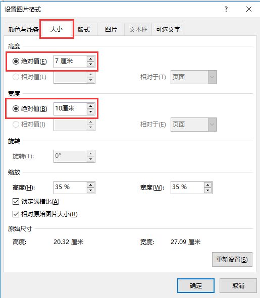 2、在弹出来的对话框“大小”选项卡下设置“高度”和“宽度”,然后点击确定。