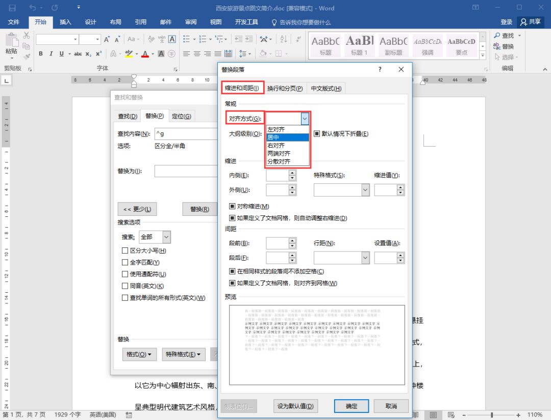 6、在弹出来的“查找段落”对话框中“缩进和间距”选项下的“对齐方式”中选择对齐方式,然后点击确定。