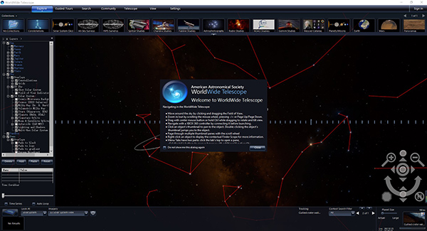 提供了事先准备好的许多收藏。像翻阅图书目录一样轻松查找,找到自己需要的内容后,点击相应图表WWT即可带你进入你所选中的天体和区域。
