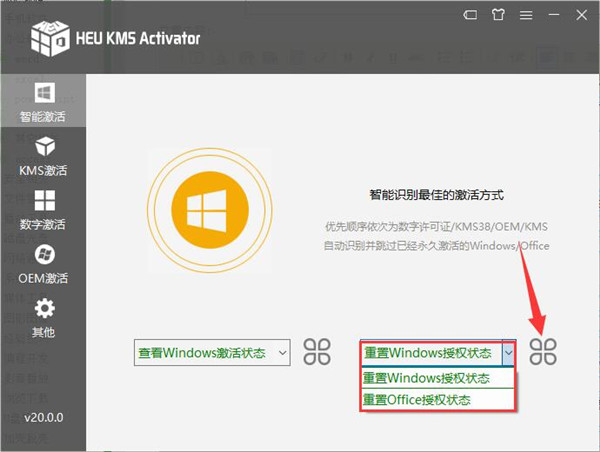 3、要想激活系统,首先选择重置Windows授权状态,然后点击后面的 logo ,等待数秒,如图