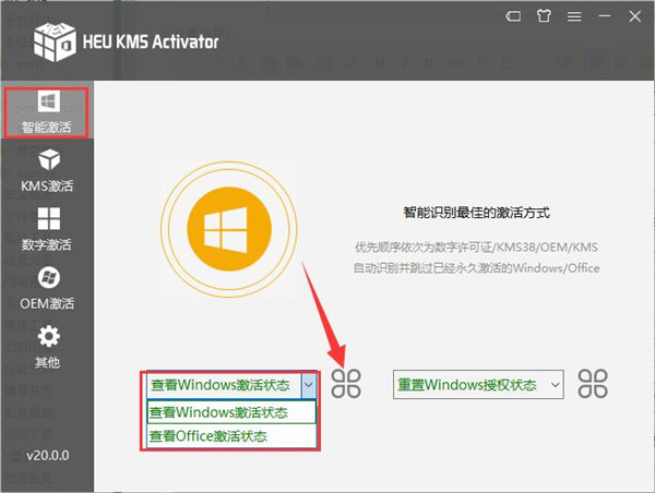 1、打开软件首先看到的是智能激活一栏; 智能激活就是大家所说的傻瓜式激活,软件会根据系统而选择激活方式,对于电脑初学者小白而言是最友好的; 但是在激活系统前,大家可以选择查看激活状态,点击查看Windows激活状态或者office激活状态,然后点击选择框后的 logo ,等待数秒即可看到激活详细的信息。