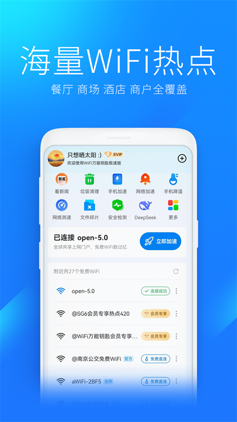 【免费使用】 海量热点库,你的手机上网神器,安全极速WiFi上网管家,节省流量,随时随地免费连接优质WiFi。 【极速顺滑】 一键查询,秒速发现免费WiFi热点,极速顺滑流畅连接,刷抖音逛淘宝打王者再无卡顿! 【精彩内容】 海量短视频,一键连接,精彩不停歇,尽在WiFi万能钥匙极速版! 【安全管理】 全面保护上网环境,热点安全检测,保护信息安全,网速测试,信号检测,认准WiFi万能钥匙官方正版APP。 【Deepseek R1-联网满血版】已接入Deepseek,免费使用深度思考+联网搜索功能,更快的速度、更强大的功能,随时随地为用户答疑解惑!WiFi万能钥匙极速版怎么查看连接设备?