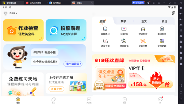 小猿AI电脑版是一款借助安卓模拟器而运行的学习教育软件,该软件可以拍照一秒检查小学作业,覆盖语文、数学、英语等科目的多种题型,是一款帮助家长、老师减轻作业检查负担的作业检查工具。同时为用户提供网课、智能练习、难题解析等多元化的智能教育服务,帮助学生系统性、高效率的完成学习闭环。
