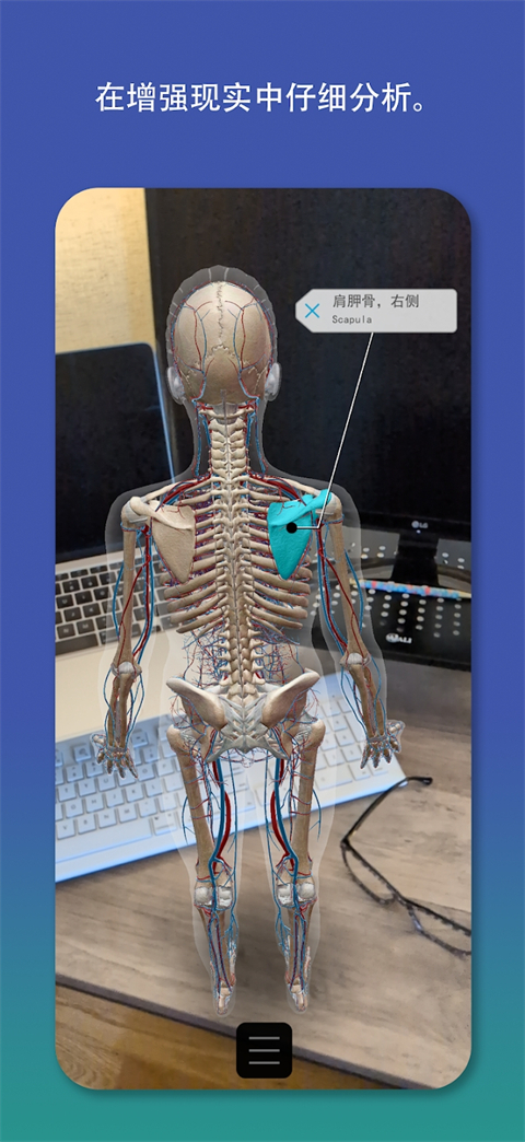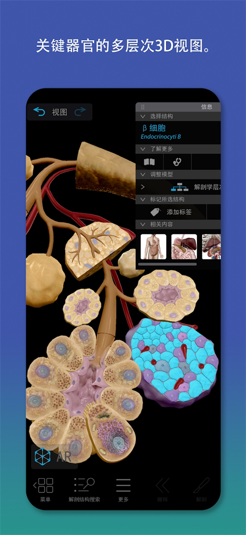 1、获取了解人体所需的全部3D交互式视觉内容: 用于研究大体解剖的完整女性和男性3D模型。配合尸体和诊断图像查看这些模型。 关键器官的多层次3D视图。学习肺、支气管和肺泡。复习肾脏、肾锥体和肾单位。 解释核心生理学和常见疾病的简短动画。使用这些内容更深入地了解系统过程! 您可以移动的肌肉和骨骼模型。学习肌肉动作、骨性标志、附着点、神经支配和血供。 了解筋膜如何将上肢和下肢的肌肉分成筋膜鞘。 额外的App内购买:我们的视频库让您能够使用90多个令人叹为观止的患者宣教动画来探索和宣教,这些动画涉及细胞呼吸、心脏传导、蠕动、滤过、冠状动脉疾病、肾结石和坐骨神经痛。 额外的App内购买: 三维牙科解剖结构包括切牙、犬齿、前磨牙、双根磨牙和三根磨牙的牙尖、牙窝和表面以及横截面视图; 还有上下牙弓的交互式动画模型。 还有更多内容!所有这些内容都经过整理归纳,因此,您可以轻松地按主题和区域进行浏览或搜索。 2、一整套学习和演示工具: 在屏幕上、增强现实(AR)和横截面中仔细分析各种模型。下载免费实验室活动,引导您了解关键结构。 参加3D解剖测验并检查您的进度。 制作与模型集关联的交互式3D演示文稿,用来解释和复习主题。使用标签、注释和3D画图来标记各种结构。 与患者、同学、学生和同事分享内容!2026人体解剖学图谱内置模型介绍