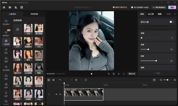 1、画质修复 【画质修复】一键AI超清!清晰度修复最强功能。 【全能修复】AI深度检测,全局多维修复,远不止画质。 【专属场景】游戏/动漫/商品图/文字图标 特调档位。 2、视频人像美容 【AI美容】幼态“减龄”只需一键!超火博主同款。 【精致五官】视频捏脸术,仙女的颜360度无死角。 【身材美型】打造紧致S线,让你的美充满氛围感。 3、视频剪辑 【视频水印】自定义添加,动态防盗,保护影片版权。 【视频截图】定格美好瞬间,发现视频中的美好。Wink电脑版使用教程