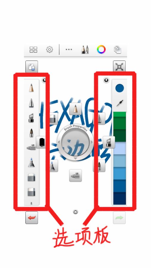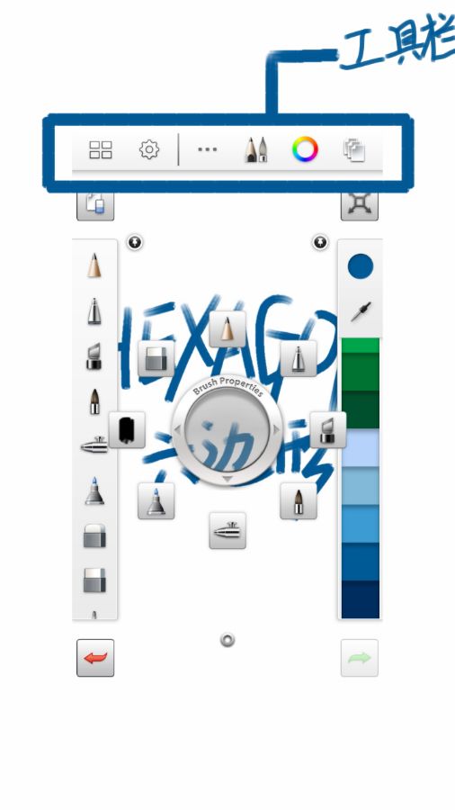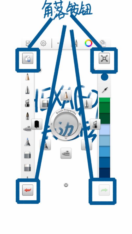 为了接下来的说明中表达清晰,我把软件分为了几个部分,分别是: 工具条,图层,环形菜单,选项板,角落按钮,画布。 1、工具条 最上面一栏,已用蓝框标识。