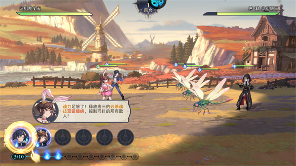 6、因为使用魂技击杀敌人会返回相应数量的魂力,所以使用唐三的魂力技可以直接秒杀前排三怪,立即返回三魂力,小舞就可以施展伤害更高的单体伤害魂技,可以直接击杀更强的后排敌人。