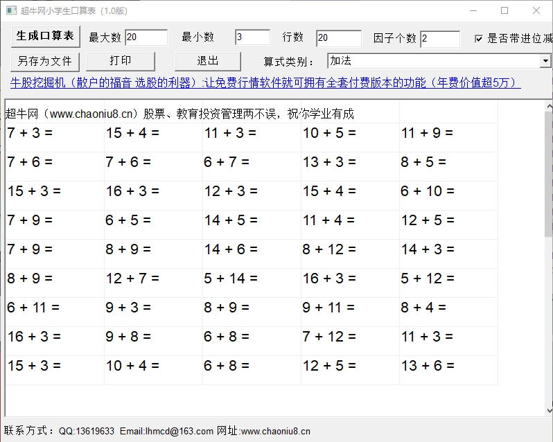 小学生口算题生成器电脑版是一款很方便的四则运算口表生成器。它可一次性生成仅百个算式,包括加法、减法、加减混合和乘法等七种算法,可帮助小学生逐步提升笔算、口算及心算能力。用户在生成的过程中,可自定义生成的最大数、最小数、行数和因子个数等内容,并可选择是否带进位数。有需要的用户欢迎下载使用。