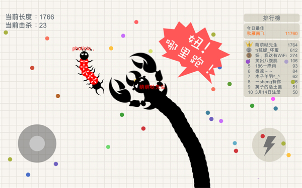 1、【多人实时对战】 多人同时激战蛇蛇战场,拉上队友消灭敌人,团队配合,轻松秒敌没商量! 2、【小蛇也能智慧反杀】 放技能围敌人,一个遥感一个技能键就能耍出丰富多变的策略!我是小蛇体态轻盈,利用技能加速也能智慧反杀! 3、【海量皮肤新鲜独特】 海量个性化皮肤,我就是独一无二,快来挑选你的专属皮肤! 4、【经典“贪吃蛇”玩法】 经典玩法重新演绎,吃光点长身体、围困敌人吃掉对方能量,比比谁吃得更快更长!我就是“贪吃”我要做最长的“蜈蚣”。玩法介绍