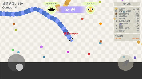 2、拖动摇杆控制小蛇的方向,吃掉地图上彩色的小豆豆,不断的变长;
