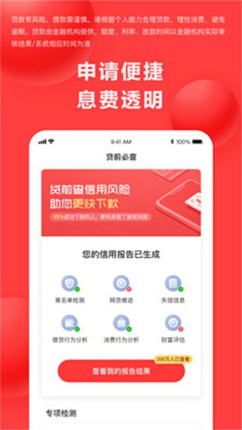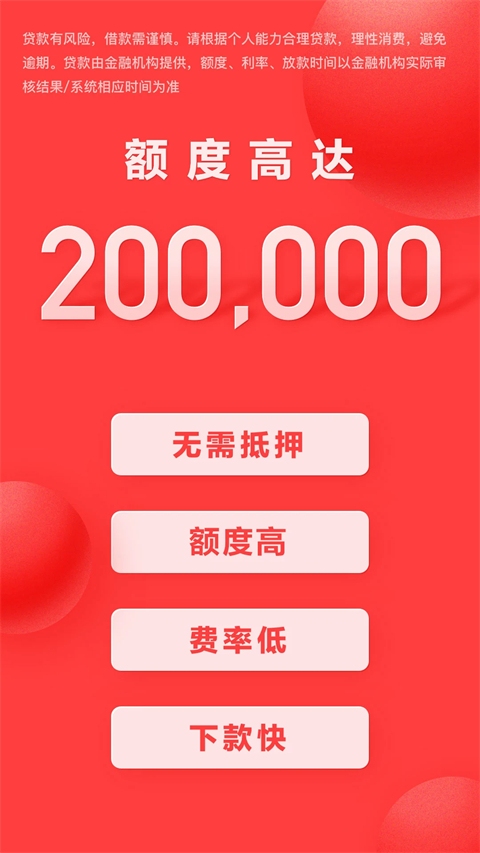 【借款额度高】 审批通过后,额度最高可达200000元! 【操作便捷】 手机在线申请,线上自动化审批,最快5分钟到账 【借还灵活】 支持多种还款方式,最长可分12期慢慢还 【安全借款】 正规金融机构,多重隐私保护,让您借贷更安心使用教程