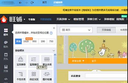 5、选择【模块】可以自定义设置模块的大小和宽度,1920代表屏幕宽,950代表页面中间的大模块,和页头的logo宽度一致,190代表左侧的【客服中心】宽度,750代表右侧的【宝贝推荐】宽度
