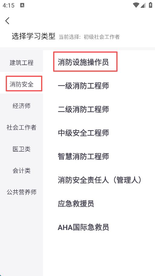 2、点击屏幕左侧的“消防安全”,随后点击“消防设施操作员”。