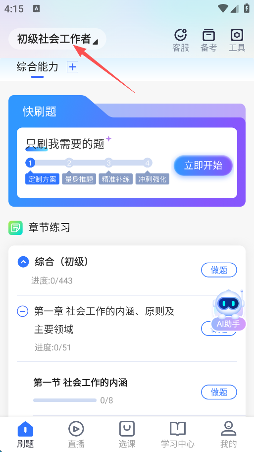 1、点击屏幕左上方的“初级社会工作者”,每个人更具创建账号的不同而显示不同。