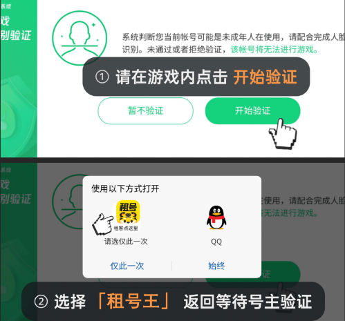 如果您遇到此类情况,先点击“开始验证”,再点击弹出的「租号王」选项,就能呼叫号主帮助解除了。呼叫号主之后必须在APP内等待哦(一般5分钟内),不要切出APP。