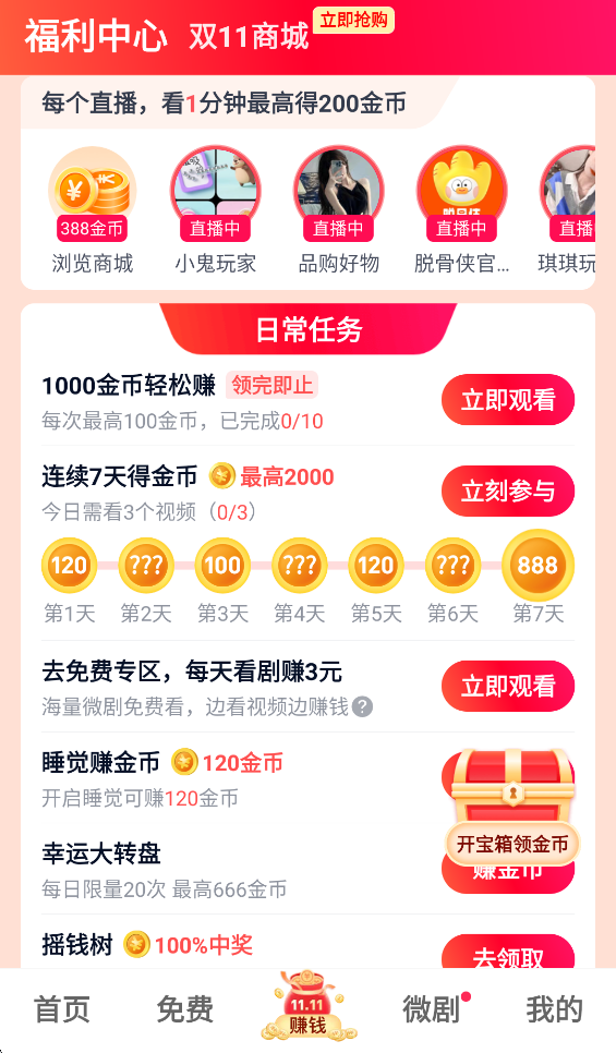 1、免费的会员是用金币兑换的,首先我们来到下方中间【赚钱】的界面,可以看到这里不仅能领红包,还能获得金币。
