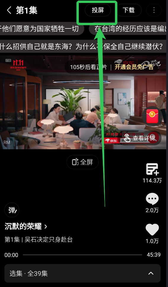 2、在竖屏视频观看界面的上方会有一个【投屏】字样,点击。