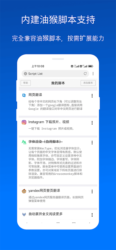 1、极速轻便 不足1M大小,占用极少资源,启动秒开 2、安全隐私 提供了丰富的隐私设置选项,最大限度的保护用户数据安全及隐私 3、极简绿色 极简干净整洁的界面交互,无新闻,无推送,无后台服务,省流省电 4、资源嗅探 强大的资源嗅探能力,轻松下载保存网络资源,图片,音频,视频一个都不能少 5、个性化 非常多的个性化配置选项,总能调教的适合你的口味 6、扩展插件 支持油猴脚本、JS脚本、本地扩展,按需提升浏览器能力软件功能