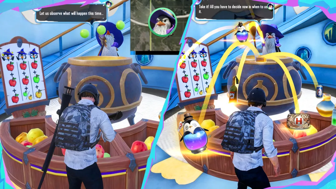 与企鹅互动后,它会随机拿出3个苹果药材炼药; 同色苹果越多,掉落的物资与变身药水奖励越丰富! 小机率触发炸锅事件,此时会产出大量企鹅魔药。