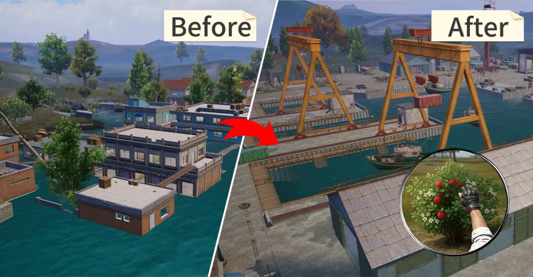Erangel地图新增Boatyard港口:位于Rozhok与Ruins区域之间的水浸村庄已经重建,升级为全新港口区域Boatyard。 这个区域的整体布局经过改善,并且增设多栋新建筑,现已在小地图直接显示名称,帮你快速定位及规划战术路线。