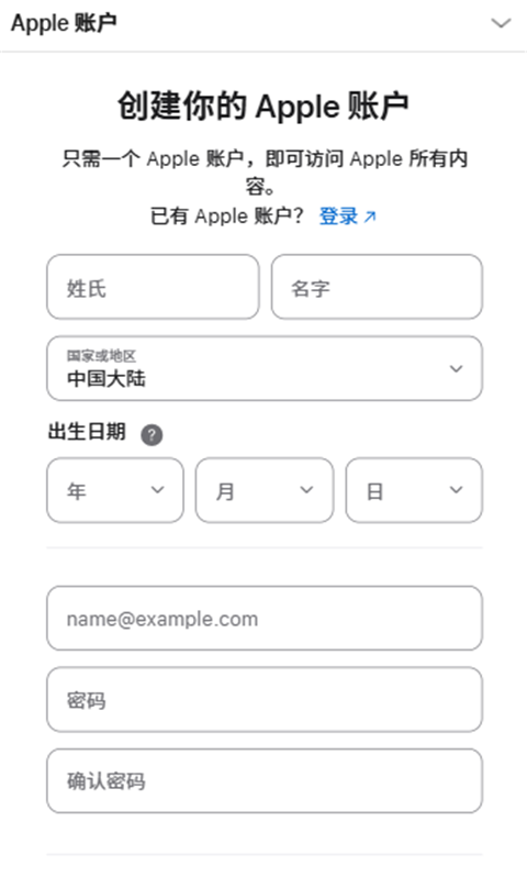 我们选择使用苹果账号(Apple)登录,游戏内无法注册,使用下方提供的苹果账号注册链接,进入注册页面后按照提示步骤进行操作: