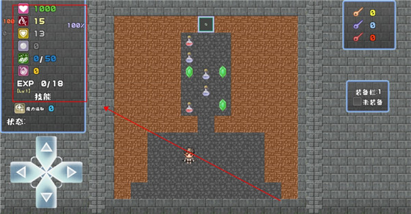 2、左上角的列表分别是你的生命值、攻击力、防御力、魔力、经验值等等