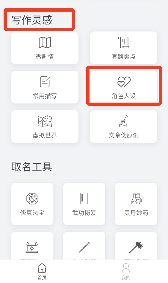 1、来到【首页】,下滑会有【写作灵感】这一栏。你可以根据你的需要选择,我们以【角色人设】为例。